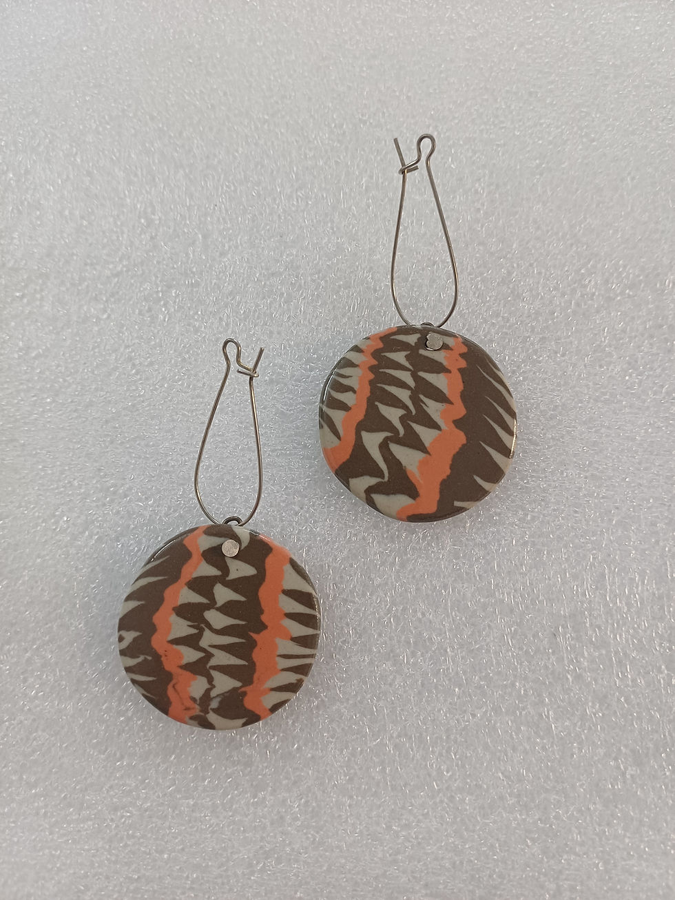 Handcrafted drop earrings featuring round ceramic discs created using the traditional Nerikomi technique, where layers of colored clay form beautiful concentric patterns within the clay. The unique design resembles natural stone formations, making each pair one-of-a-kind. Finished with delicate lotus-inspired metal studs, these lightweight earrings blend nature-inspired beauty with contemporary handcrafted ceramic artistry. ✨